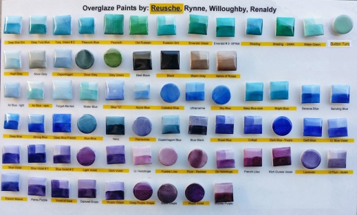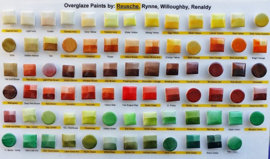 We offer over 170 of the finest quality, high gloss, porcelain china paints. Most of the tested samples show: 1st, 2nd, and 3rd fires. Click our color charts below to enlarge.